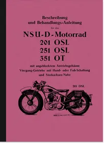 Bedienungsanleitung für die NSU Motorräder 201 OSL, 251 OSL und 351 OT mit 4-Gang-Getriebe, Hand- oder Fußschaltung und angeblocktem Antriebsgehäuse. Ausgabe 6/1936.