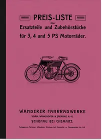 Ersatzteilliste für die Wanderer Motorräder 3 PS, 4 PS und 5 PS, mit Riemenantrieb und elektrischer Zündung.