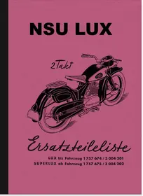 Ersatzteilliste für NSU 2-Takt Motorräder Lux (bis Fahrzeug 1757 674 / 3004 201) und Superlux (ab Fahrzeug 1757 675 / 3004 202). Ausgabe März 1955.