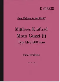 Ersatzteilliste für Moto Guzzi Alce 500 ccm, Militärausführung. Ausgabe 7/1944, in deutsch. Dienstvorschrift D 618/38.