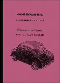 Bedienungsanleitung für Goggomobil T 250, T 300, T 400, TS 250, TS 300 und TS 400 Kleinwagen mit vorne angeschlagenen Türen und Schaltgetriebe. Für Limousine und Coupé. Ausgabe 1968, in deutsch.