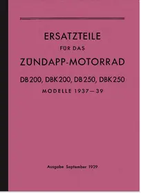 Ersatzteilliste für Zündapp DB 200/250 und DBK 200/250. Modelle 1937-1939. Ausgabe 9/1939.