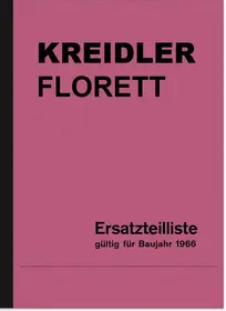Ersatzteilliste für Kreidler Florett 3-, 4- und 5-Gang mit 1/2/2,6/3,6 und 5,2 PS, für Modelle Baujahr 1966. Handschaltung und Fußschaltung mit Kickstarter und Tretkurbel, Gebläsekühlung. Ausgabe in deutsch.