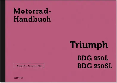 Bedienungsanleitung für Triumph BDG 250 L/SL Doppelkolben 2-Takt Motor mit Hinterrad-Federung, hydraulischer Hinterradbremse und Teleskopgabel. Inklusive Angaben zum Seitenwagen. Ausgabe Januar 1954, in deutsch.
