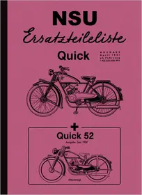 Ersatzteilliste für NSU Quick und Quick 52 Motorfahrrad, ab Fahrzeug 1 451 831/538 993. Ausgabe April 1951 (Quick)/Juni 1952 (Quick 52), in deutsch.