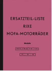 Ersatzteilliste für Rixe 98 ccm, 125 ccm, 150 ccm und 175 ccm T, K, D und H mit ILO und Sachs-Motoren. Ausgabe in deutsch.