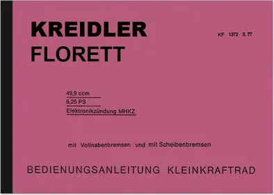 Bedienungsanleitung für Kreidler Florett Modell 1977, 50 ccm, 6,25 PS mit Elektronikzündung, Trommel- und Scheibenbremsen. Ausgabe in deutsch.