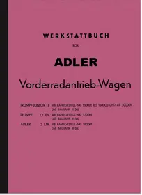 Reparaturanleitung für Adler Trumpf 1,7 EV ab Fgst.-Nr.170001 ab 1936, Trumpf Junior 1E ab Fgst.-Nr. 130001 bis 150000 und 300001 ab 1936, Adler 2 ltr. ab Fgst.- Nr.180001 ab 1938. Ausgabe Februar 1939, mit 16- und 17 Zoll Rädern.