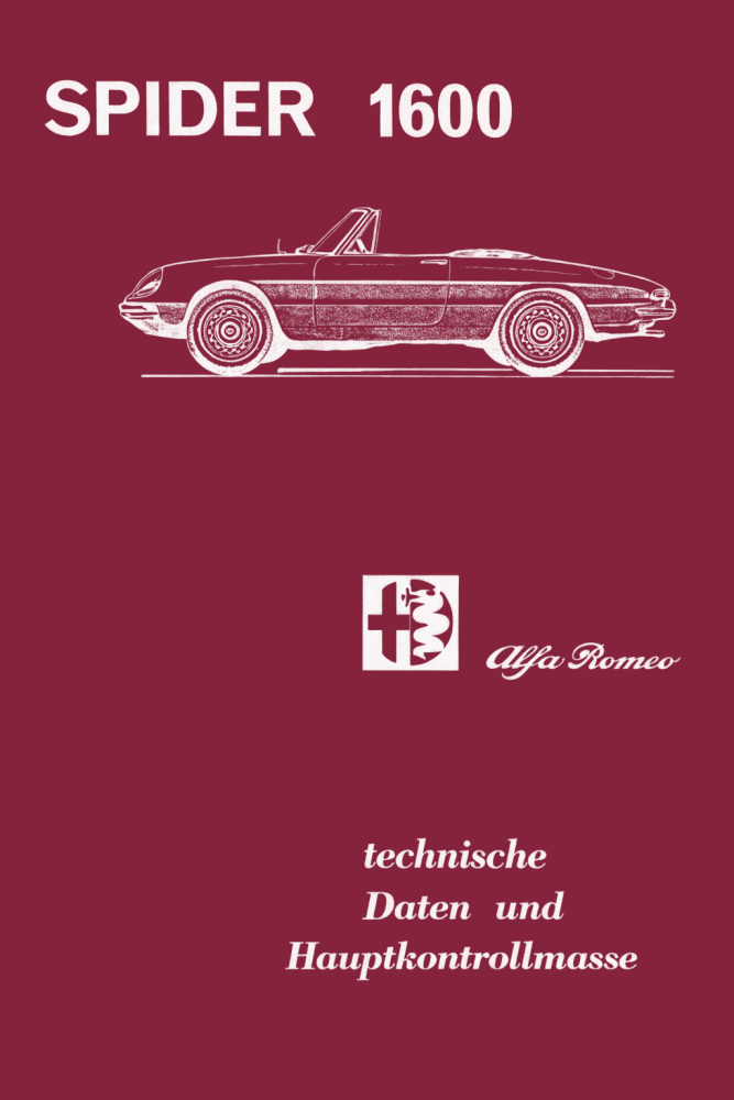 "Technische Daten und Hauptkontrollmaße" (ähnlich Bedienungsanleitung/Reparaturanleitung) für den Alfa Romeo Spider 1600 (Rundheckspider).