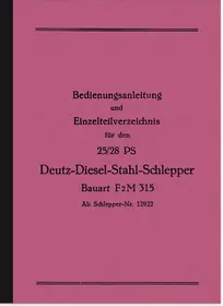 Bedienungsanleitung und Ersatzteilliste für Deutz Diesel-Stahl-Schlepper 25/28 PS, Typ F2 M 315. Ausgabe 1936, in deutsch.