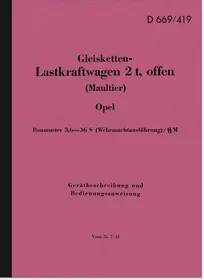 Bedienungsanleitung für Opel Gleisketten LKW (Maultier) 2 t. offen. Dienstvorschrift D 669/419. Ausgabe 1943. Baumuster 3,6 36 S. Wehrmachtsausführung.