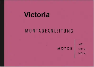 Werkstatt-Handbuch für Victoria Motortypen M 51 / M 51 D / M 51 K, 2-und 3-Gang Schaltung mit Kickstarter und Tretkurbel, 1,45 und 2,54 PS, Alu- und Graugußzylinder, Ausgabe ca. 1958 für die Modelle Vicky III N, Vicky IV, Vicky Luxus/Standard, Avanti SM 51 /52 /K SM 51, Preciosa, (Motor auch in DKW und Zweirad- Union Mopeds verbaut).