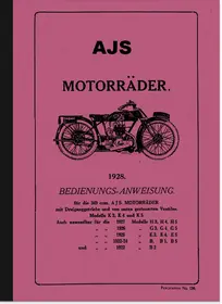 Bedienungsanleitung für AJS 350 ccm Motorräder SV-Modelle mit 3-Gang Getriebe, 1922-1928, Modelle: K 3/4/5, H 3/4/5, G 3/4/5, E 3/4/5, B, B 1/2/5. Ausgabe in deutsch.