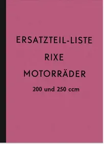 Ersatzteilliste für Rixe 200 ccm und 250 ccm Motorräder mit Telegabel, Geradeweg-Federung und Vollnabenbremse. Ausgabe etwa 1953, in deutsch.