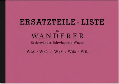 Ersatzteilliste für Wanderer Sechszylinder Schwingachswagen W 35, W 40, W 45, W 50 und W 51. Ausgabe etwa 1936.