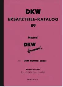 Ersatzteilliste für DKW Hummel Standard bis Fgst. 01 511 941/ Hummel Standard und Luxus ab Fgst. 01 518 924/ Hummel Standard und Luxus ab Fgst. 01 551 101/ Hummel Super. Ausgabe von 7/1957, in deutsch. DKW-Nr. 89 mit alter und neuer Gabel.