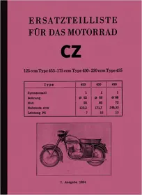 Ersatzteilliste für CZ 125 ccm (Type 453, 453/05, 473), 175 ccm (Type 450, 450/05, 470), 250 ccm (Typ 455, 455/0, 475), 1. Ausgabe 1964 in deutsch.