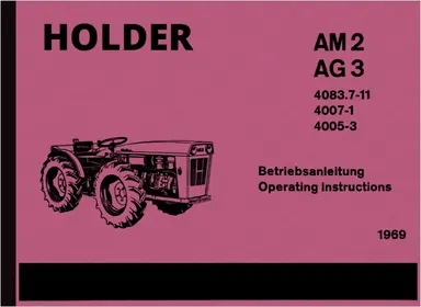 Bedienungsanleitung für Holder AM 2 mit Motor HD 2 (20 PS) und AG 3 mit Motor HD 3 (30 PS), inkl. Dreipunkt-geräteaushebung 4001-3, Anbauvorrichtung für Normdreipunkt- geräte 4001-7, Bodenbearbeitungsgeräte Hackfräse 4083.7-11, Zweischarpflug 4007-1, Gerätetragrahmen 4005-3, Pflanzlochbohrer Klein. Ausgabe 1969, in deutsch und englisch.