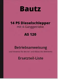 Bedienungsanleitung und Ersatzteilliste für den Bautz AS 120 Dieselschlepper, mit MWM KD 211 Z Motor, 14 PS und 4-Ganggetriebe. Inklusive Schaltplan der Elektrik, Schmieranweisung und An- und Abbau des Mähwerks.