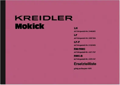 Ersatzteilliste für Kreidler Florett LH ab Fgst.-Nr. 3 446 651, LF ab Fgst.- Nr. 3 097 353, LF-F ab Fgst.-Nr. 3 100 603, RM/RMC ab Fgst.-Nr. 4 071 757, RMC-B ab Fgst.- Nr. 4 076 107, 3- und 4-Gang, gültig ab Baujahr 1976.