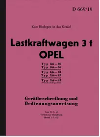 Bedienungsanleitung und Gerätbeschreibung für Opel 3 t. Lastkraftwagen Typ 3,6 (36/42/47). Ausgabe 22.8.1940 (Stand 1.7.1944), in deutsch. Wehrmacht, Dienstvorschrift D 669/19.